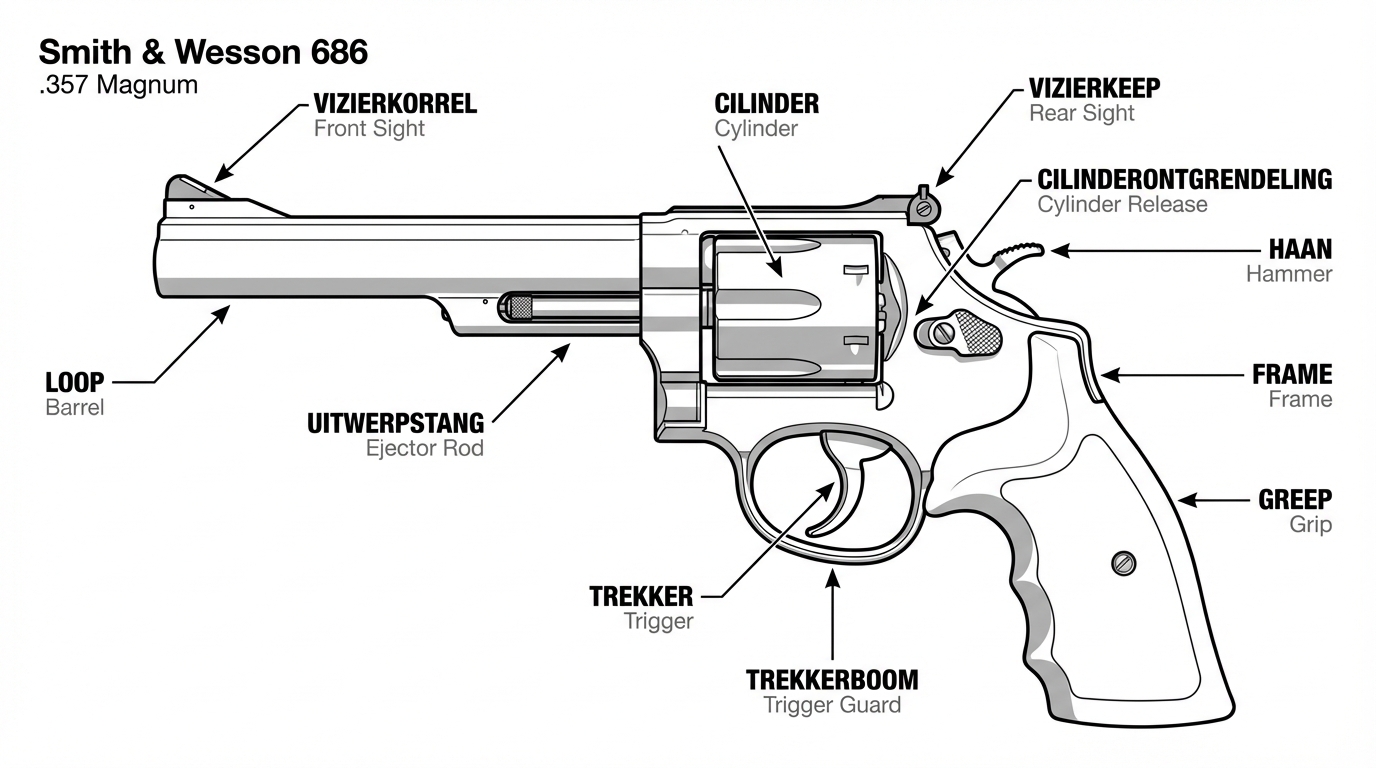 | 2 | Cilinder/Trommel | Draaiende kamer die patronen bevat |